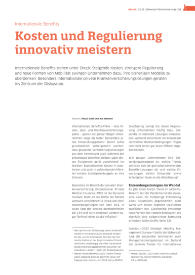 Unser Experte Kai Mehnert, Senior Consultant International Health bei Mercer Schweiz, hat sich in einem gemeinsamen Artikel mit Pascal Dudli, Leader International Employee Benefits bei unserem Partnerunternehmen KESSLER & CO AG, in der aktuellen Ausgabe der «Schweizer Personalvorsorge» mit den Trends und Herausforderungen aus Sicht von Unternehmen und Versicherern befasst.