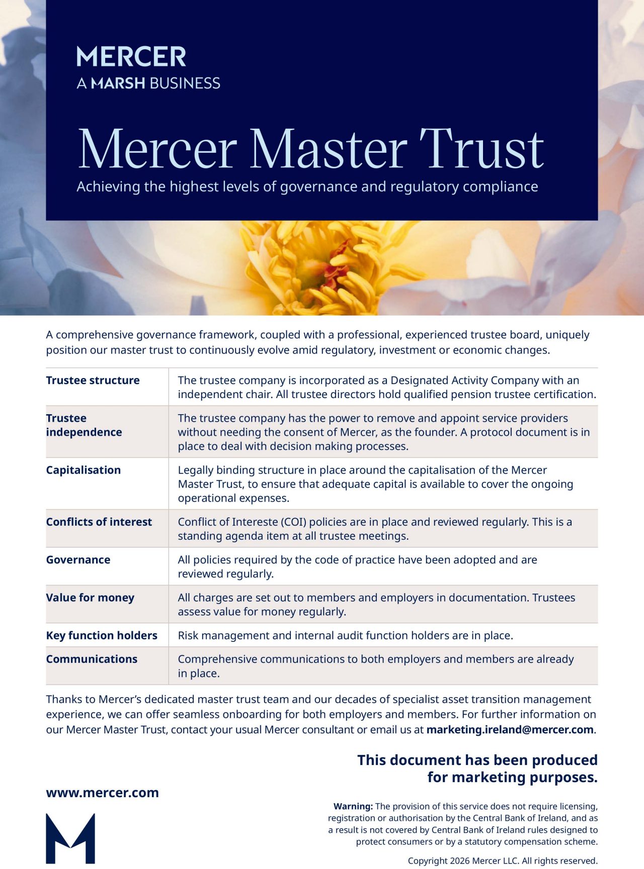 Mercer’s size, experience and expertise, coupled with our world-class investment, administration, governance and communications capabilities, uniquely position the Mercer Master Trust to deliver a compelling master trust experience in the Irish market.