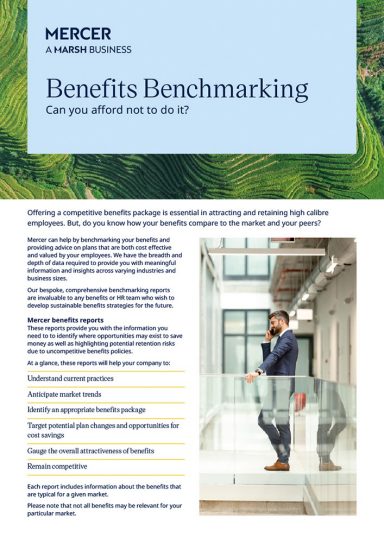 Mercer can help you by benchmarking your benefits and providing advice on plans that are both cost effective and valued by your employees. We have the breadth and depth of data required to provide you with meaningful information and insights across varying industries and business sizes.