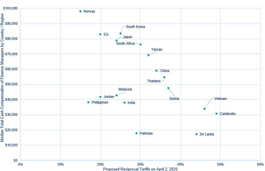 Exhibit 2: Median Total Cash Compensation of Finance Managers by Country / Region Against Initially Proposed US Reciprocal Tariffs on April 2, 2025 for Selected Countries