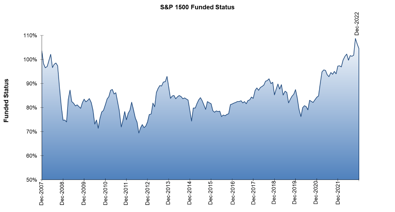 - Funded status improved steadily through the first 3 quarters of the year, before soaring to as high as 109% at the end of October and subsequently fading to end the year. By the end of 2022, funded status increased to 105% from the 97% measured at the end of 2021.
