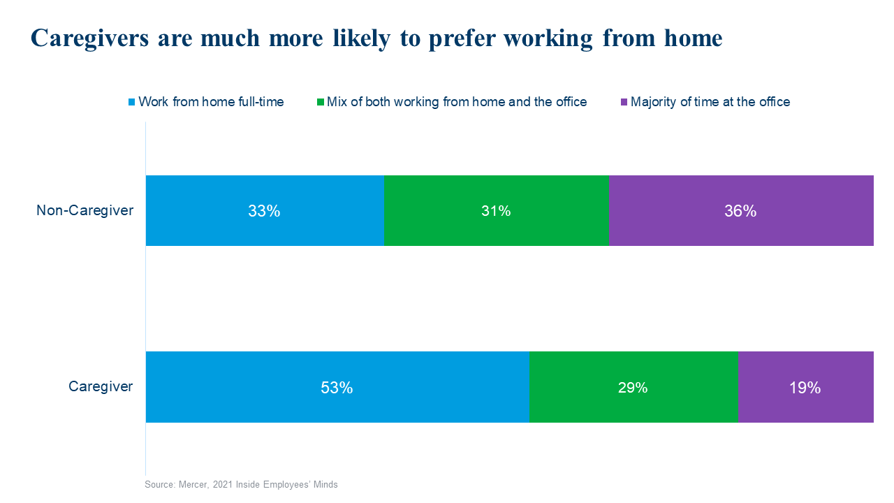 But while the pandemic has heightened the pressure on caregivers – and the need for employers to act swiftly to alleviate it – caregiving is a chronic rather than an acute need. Employers need to think about supporting caregivers for the long-term with flexibility at work (flexing when and how work gets done), flexibility from work (leave and time-off policies), and with caregiving benefits (support, resources and subsidized care).