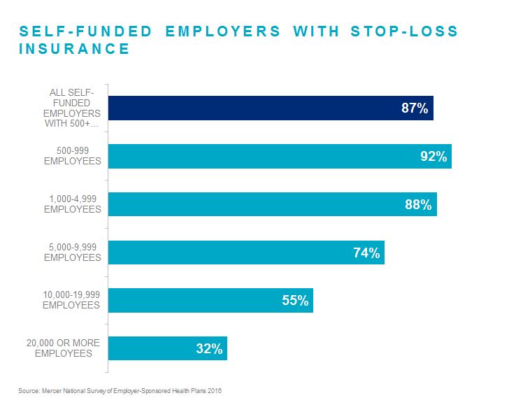 Traditionally, the majority of self-funded employers have purchased stop loss insurance to protect themselves from unexpected catastrophic claims. In 2016, 87% of all large self-funded employers (those with 500 or more employees) purchased stop loss coverage – although among the very largest (20,000 or more employees), this drops to 32%. As the frequency and severity of catastrophic claims have increased exponentially, employers that don’t purchase stop loss should review their previous strategies to ensure they are still appropriate.